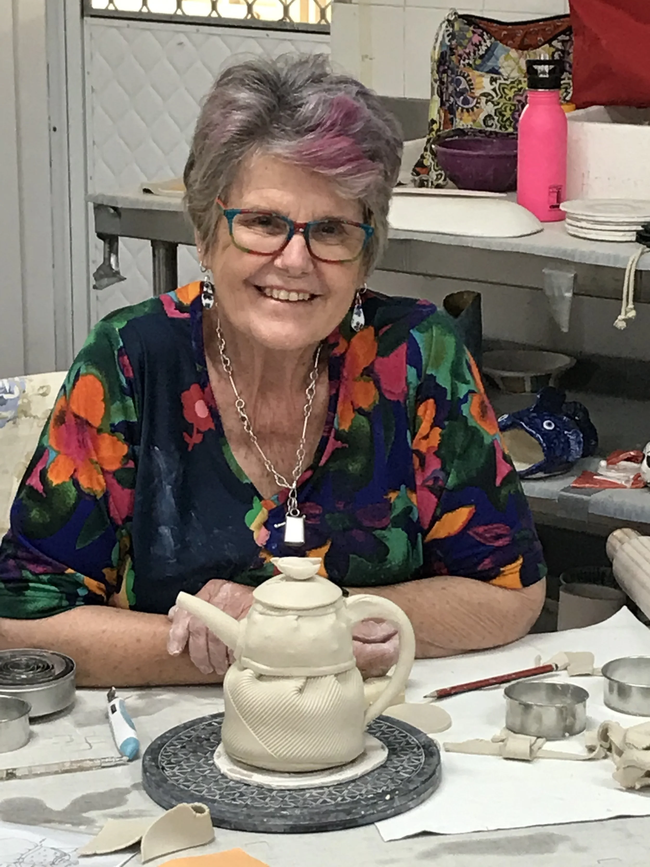 I enjoy giving workshops and demonstrations, mainly working with soft slabs, decorating, cutting and forming the clay into Teapots, Mugs, Platters and Vase forms.